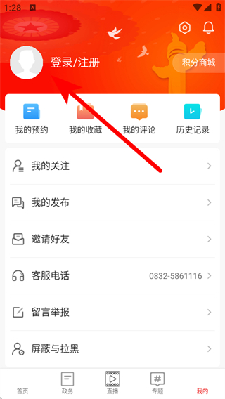 2、在个人页面中,点击登录/注册区域,进入登录的界面。
