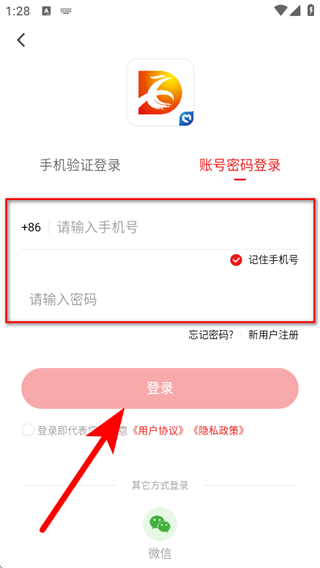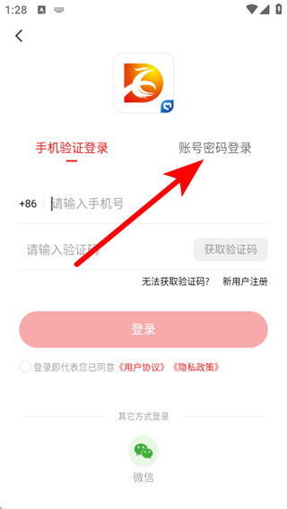 3、在登录界面,点击账号密码登录,进入账号密码登录页面。