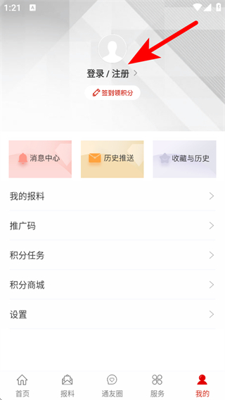 2、在个人的页面,点击登录/注册的区域,进入登录注册的界面。