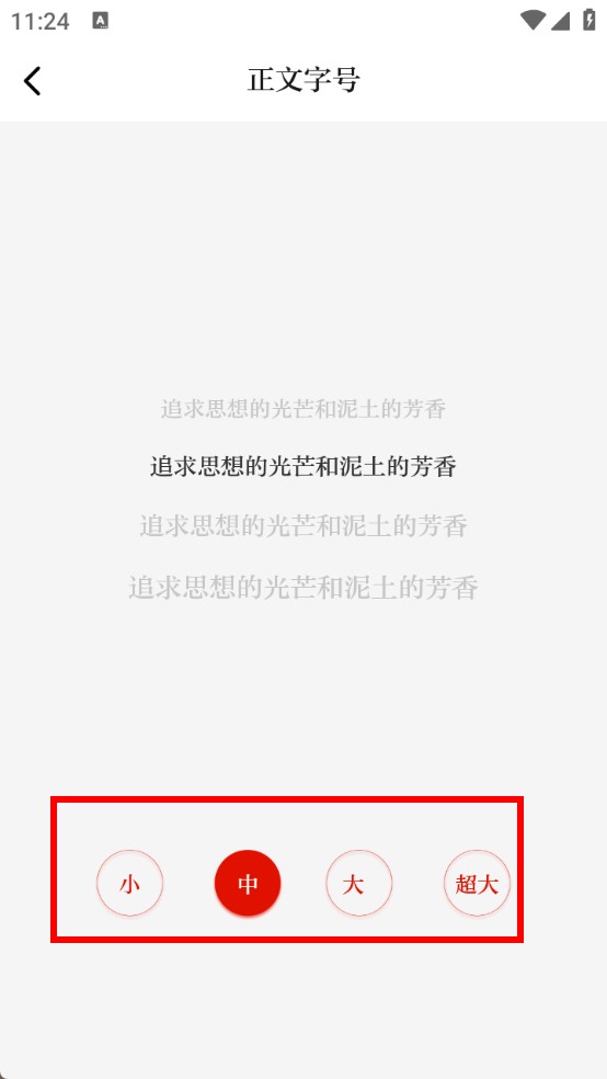 4、在正文字号设置页面,选择小、中、大、超大其中一个选项,即可完成字体大小的更改。