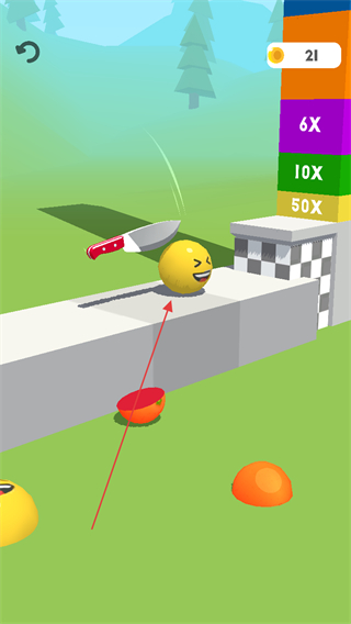 3、在赛道上灵活操控刀具,切割黄色笑脸球等目标,向终点前进。
