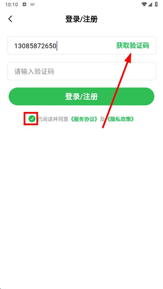 2、在登录注册页面,输入手机号,勾选已阅读并同意协议,点击获取验证码。