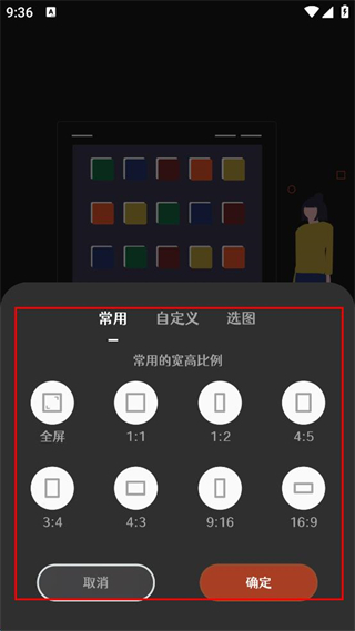 4、返回制作页面,可选择常用宽高比例如全屏、1:1等,点击确定后开始制作。