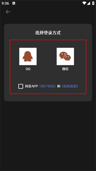 3、选择QQ或微信登录,勾选同意用户协议和隐私政策后完成登录。
