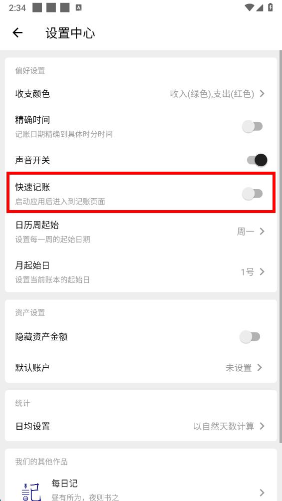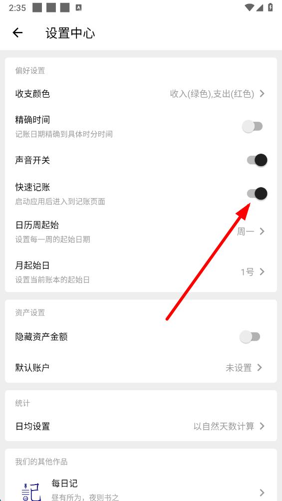 4、点击快速记账右侧的开关,将其由灰色变为黑色开启状态,即可完成快速记账设置。