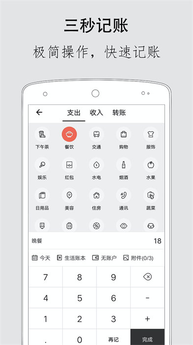 4.快速记账:一键记账,记账就是这么简单,多种账目分类,让您的账单轻轻楚楚