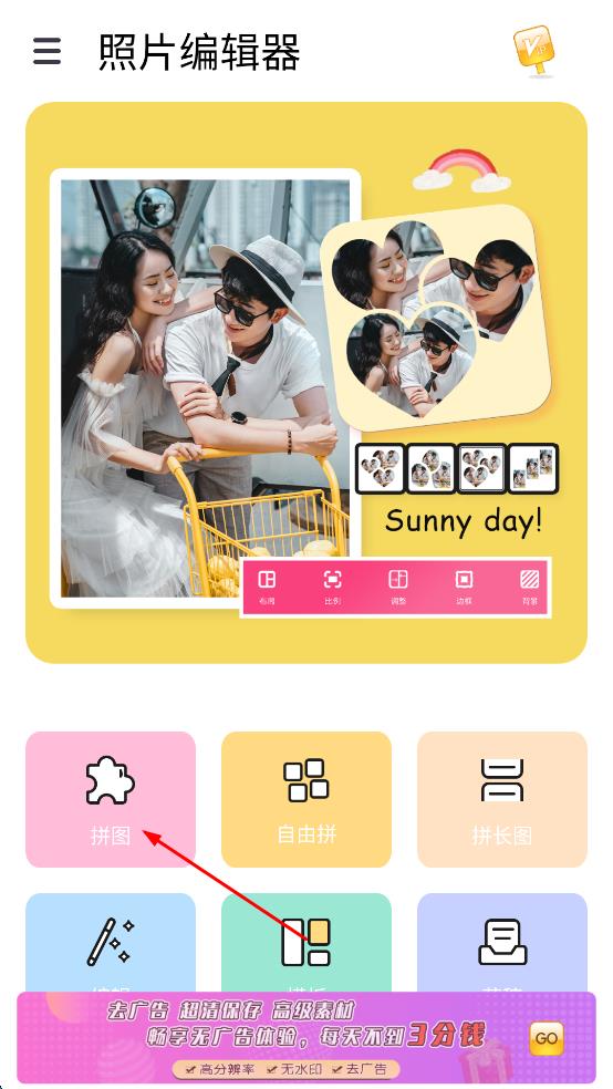 1、打开照片编辑器,点击“拼图”。