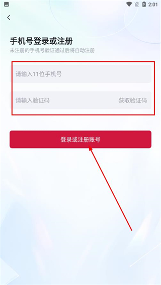 3、输入手机号,填入验证码,点击登录或注册账号,将自动注册。