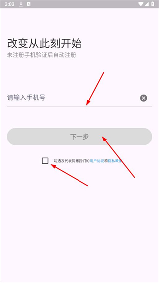 1、在律动健康APP注册页面,输入手机号,勾选协议后,点击下一步。