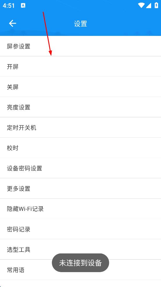 3、点击右上角设置图标,进入设置页,可对屏参、开屏、关屏、亮度等进行配置,完成后保存节目设置。