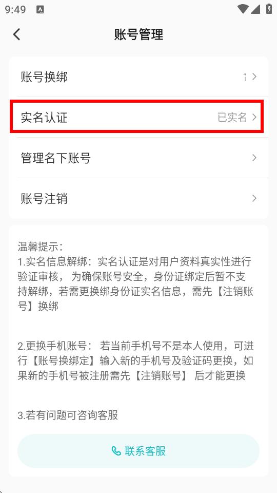4、进入账号管理页面后,点击实名认证选项,按照后续提示完成实名认证相关操作即可。