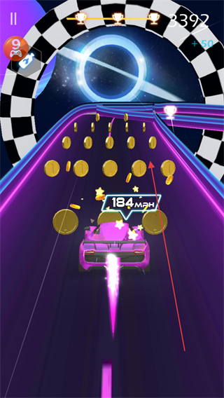 1、在充满霓虹特效的赛道上驾驶赛车,通过左右移动赛车来躲避障碍物、收集金币和蓝色宝石等资源。