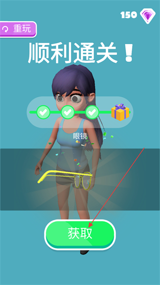 4、完成表情调整后,顺利通关,可点击获取按钮领取奖励,如服饰道具等。