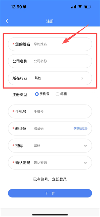 2、在注册界面,填写姓名、公司名称,选择所在行业。