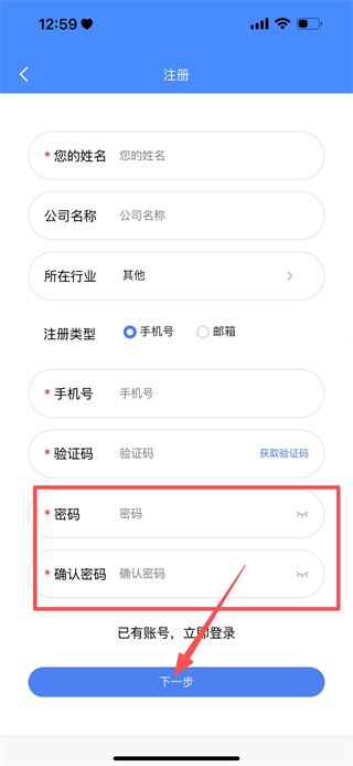 4、设置登录密码并再次确认密码,点击下一步,完成账号注册操作。