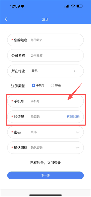 3、选择注册类型为手机号,输入号码后点击获取验证码并输入验证码。