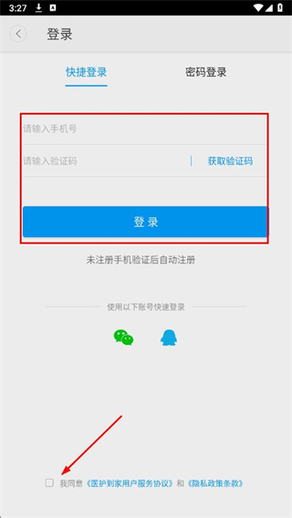 3、输入手机号和验证码,勾选协议,点击登录,自动注册。