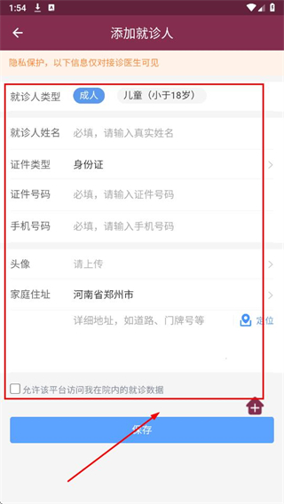 4、选择就诊人类型,依次填写信息,勾选允许访问,点击保存。