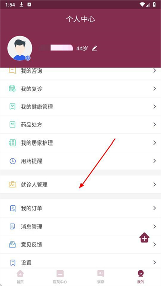 2、在个人中心页面,点击就诊人管理选项。
