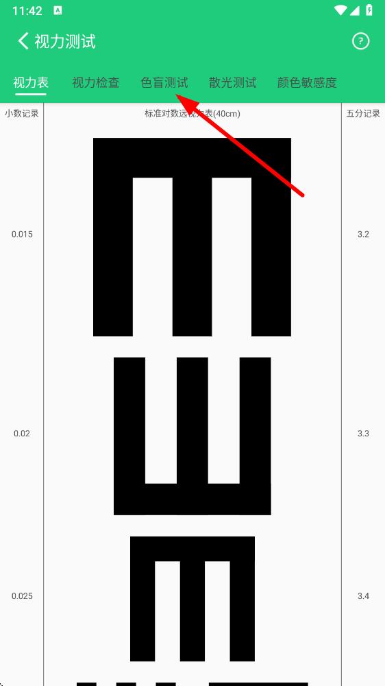 2、在视力测试页面上方的功能导航栏中,点击色盲测试选项,进入色盲测试界面。