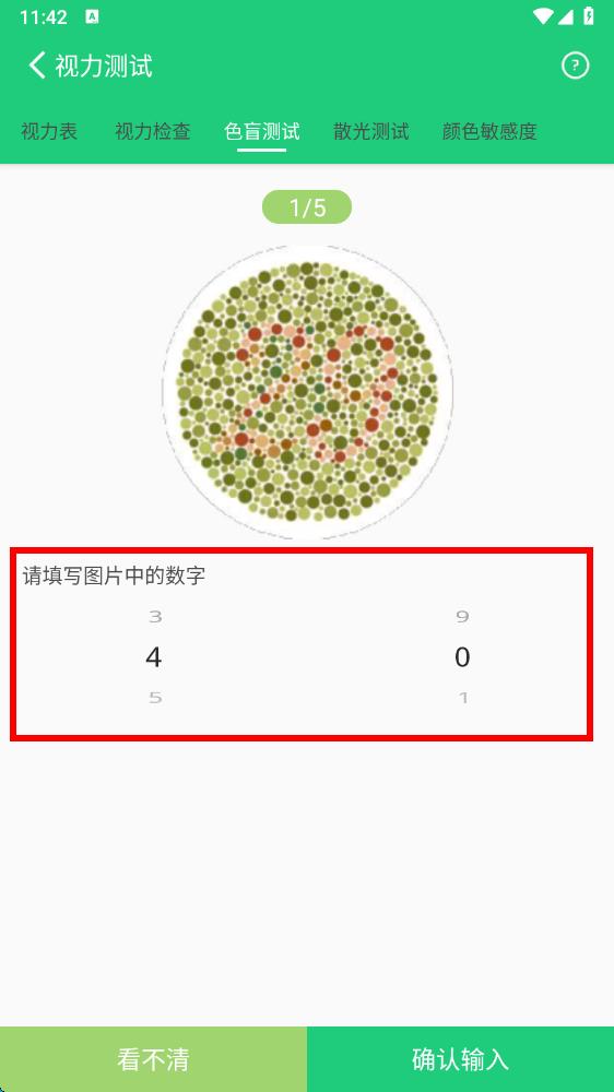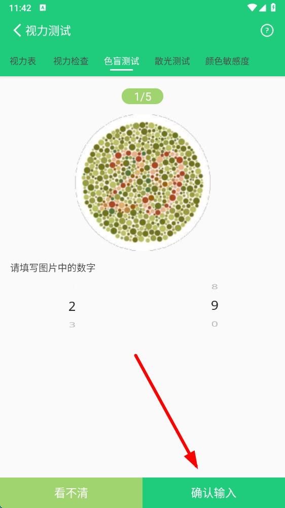 3、进入色盲测试界面后,会显示色盲测试图片,根据图片中显示的数字或图案,在下方输入框中选择对应的数字。
