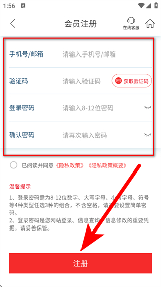 4、输入手机号邮箱、验证码、登录密码、确认密码,勾选已阅读并同意后,点击注册,完成操作。