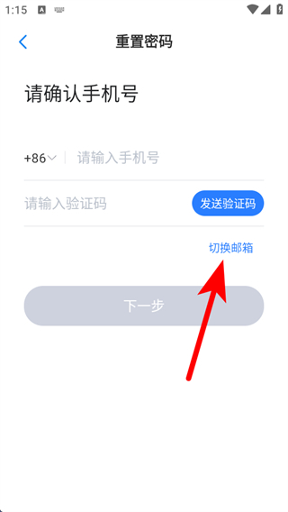 2、进入重置密码页面,可选择点击切换邮箱通过邮箱验证。