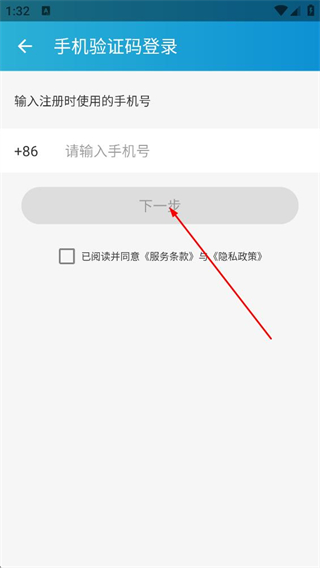 2、在手机验证码登录界面,输入手机号,勾选已阅读并同意后点击下一步。