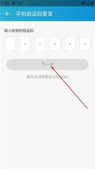 3、在输入验证码界面,输入收到的6位验证码后点击下一步,完成登录操作。