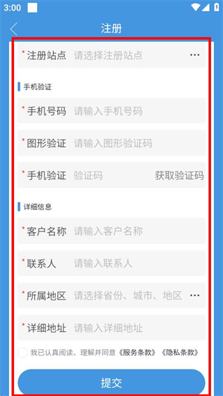 4、在注册页面,填写信息并勾选协议后,点击提交,即可完成注册。