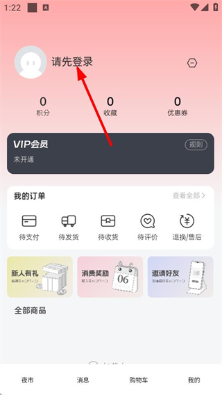 1、在夜市首页,点击右下角我的选项,进入个人页面。