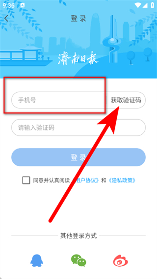 3、在登录页面输入手机号,点击获取验证码。