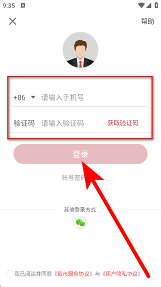4、在短信登录界面,输入手机号和验证码后,点击登录。