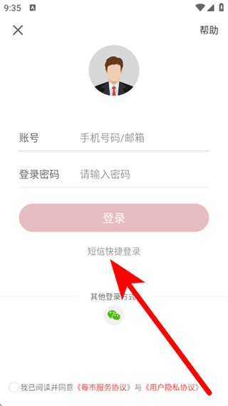 3、在登录界面,点击短信快捷登录,切换至短信登录模式。