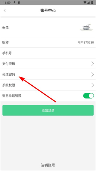 3、在账号中心页面,点击修改密码选项,进入修改密码页面。