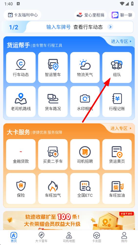 1、打开车旺大卡app,在首页货运帮手的板块中,点击组队图标。