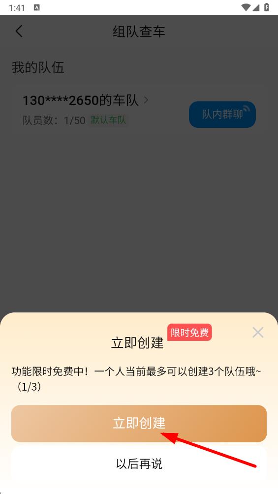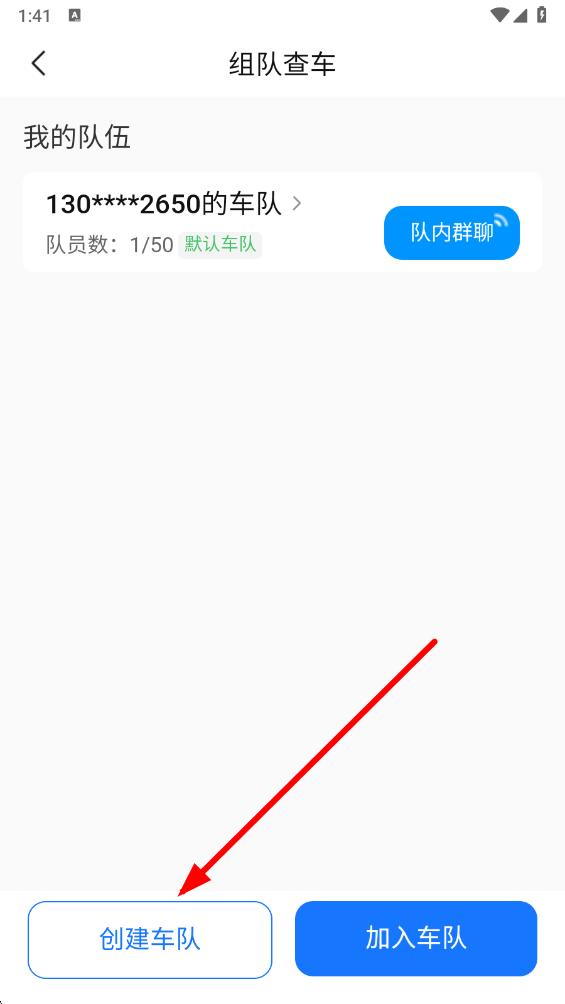2、进入组队查车页面后,点击下方的创建车队按钮。