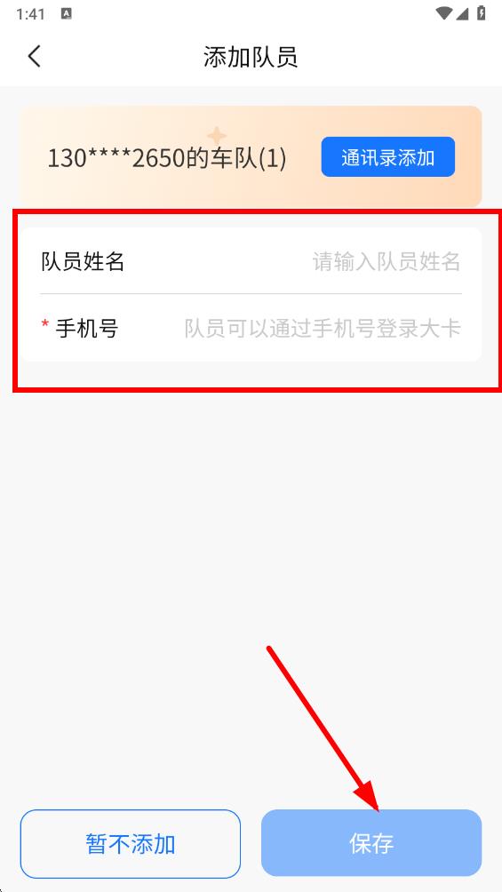 4、进入添加队员页面,输入队员姓名和手机号,确认信息无误后点击保存,即可完成组队查车的车队创建和队员添加。