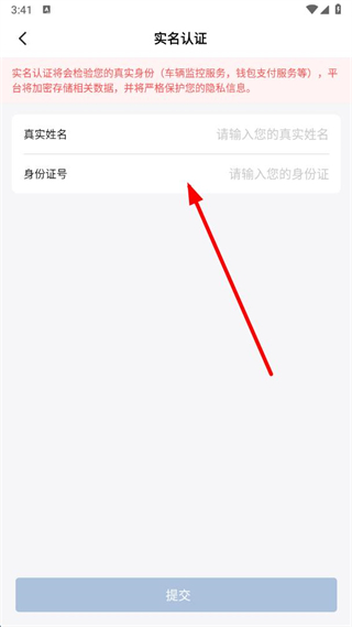 4、在实名认证页面,输入真实姓名和身份证号,点击提交按钮完成车主认证。