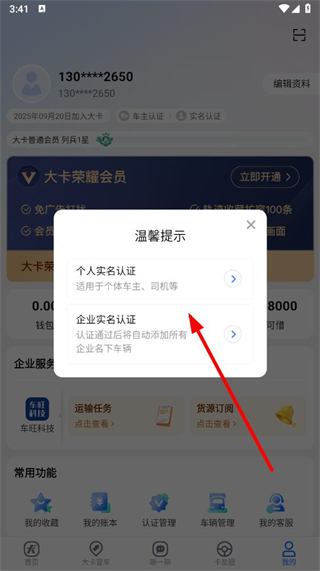 1、打开车旺大卡app,点击右下角我的选项,进入个人页面。