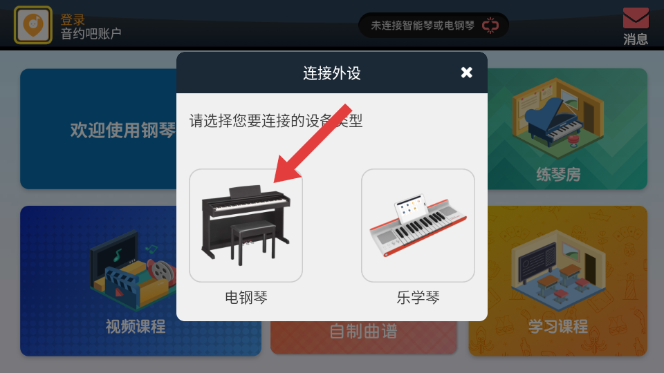 2、在连接外设的弹窗中,点击电钢琴的选项,选择要连接的设备类型。