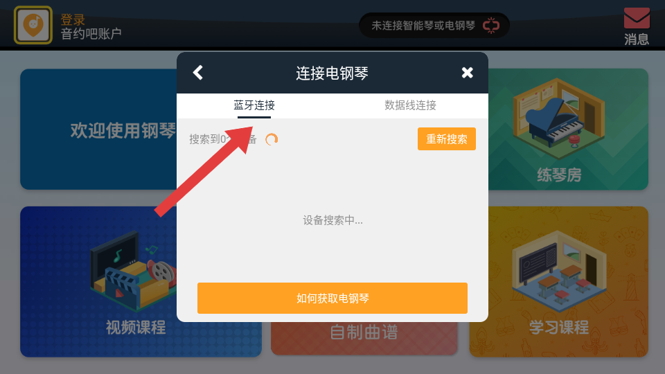 1、在钢琴教练主界面,点击顶部未连接智能琴或电钢琴提示区域,触发外设连接流程。
