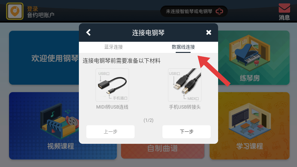 4、若选择数据线连接,需准备MIDI转USB连线等,按提示通过线材连接。