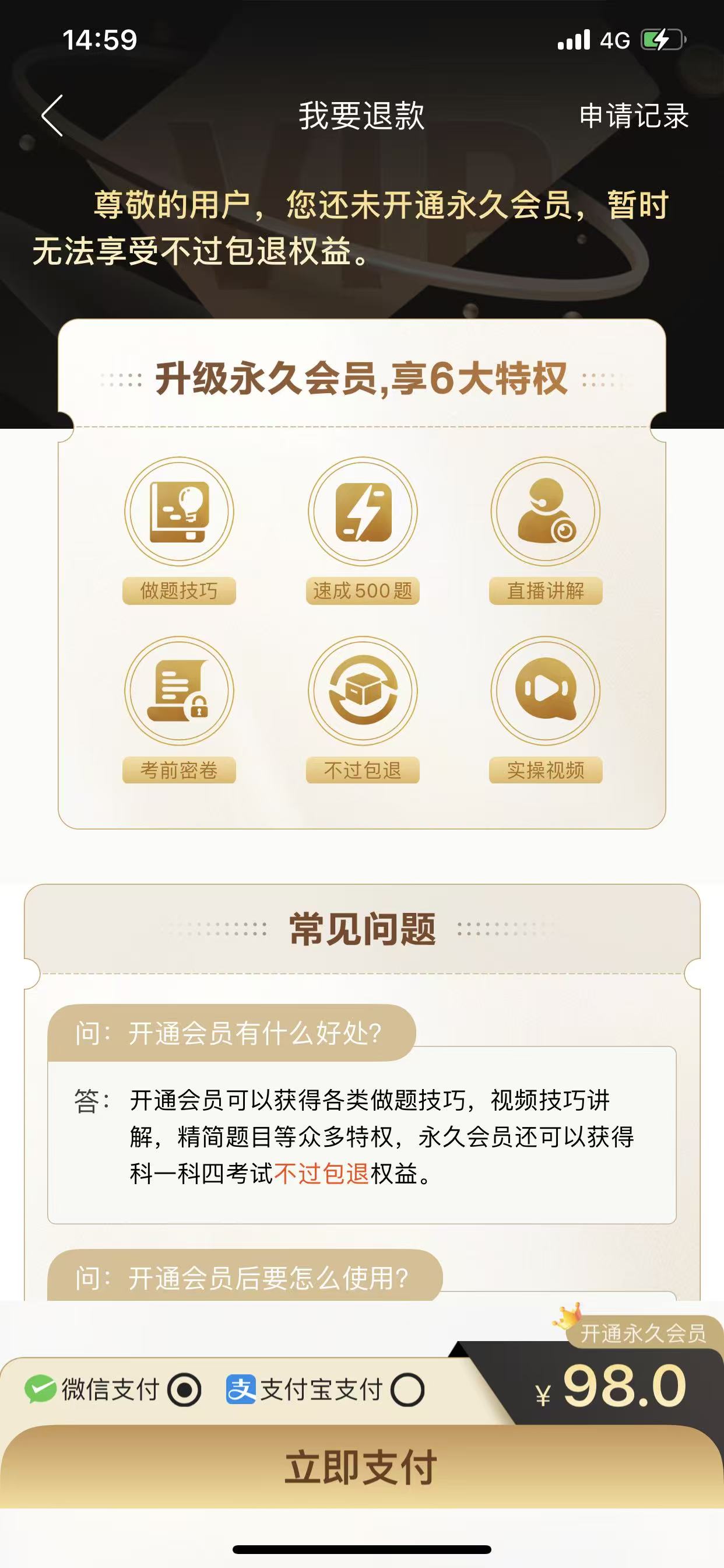 4、进入我要退款页面后,根据页面提示,查看退款条件,选择支付方式,点击立即支付完成相关操作。