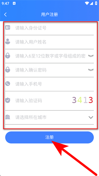 4、输入身份证号、设置密码等信息,输入验证码,点击注册,完成操作。