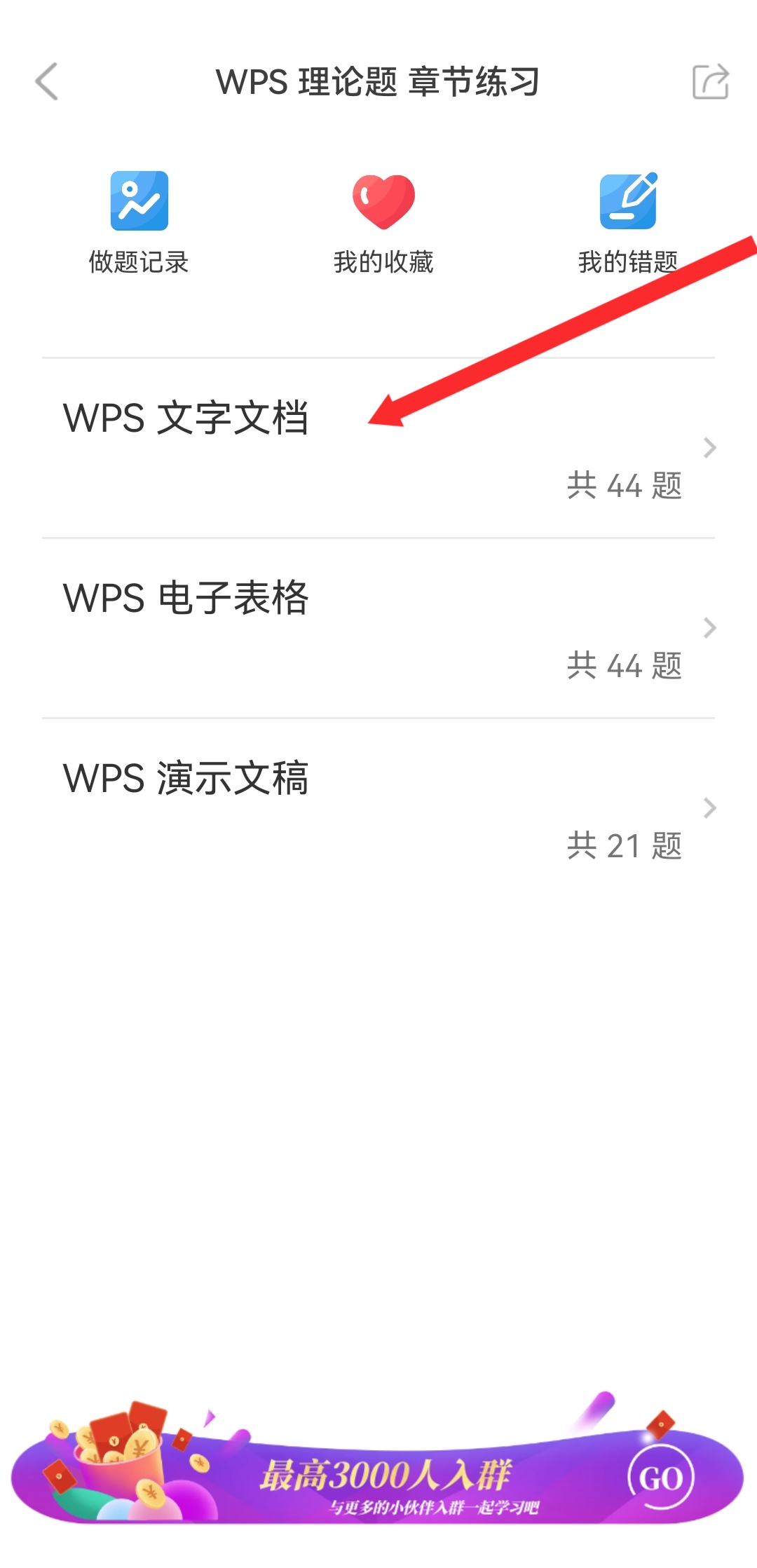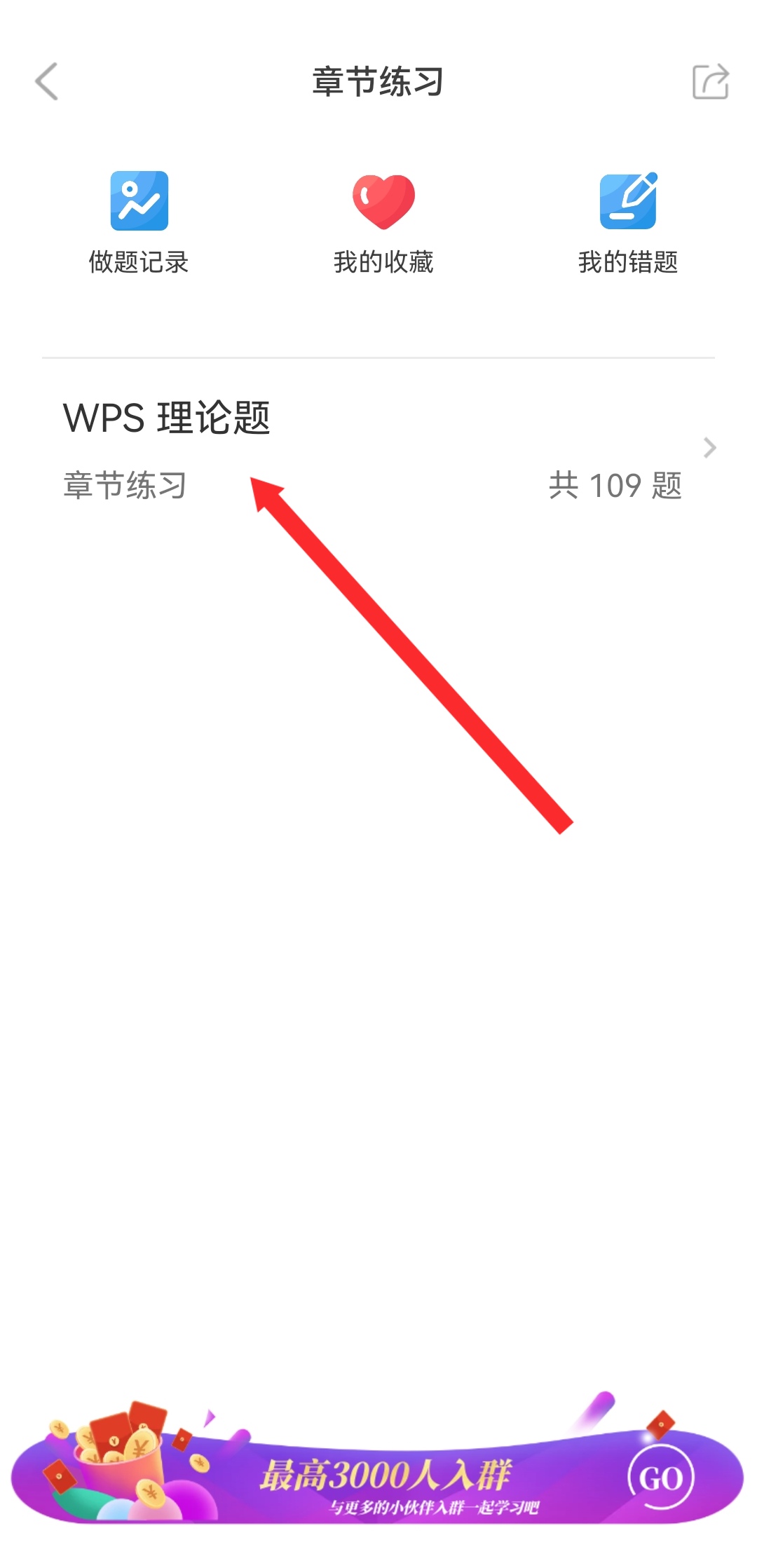 2、在章节练习列表中,点击WPS理论题,进入理论题练习的界面。
