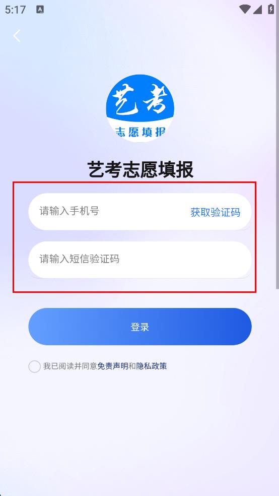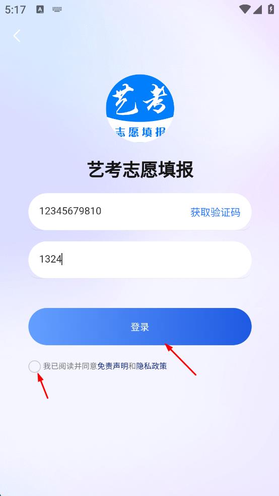 1、打开艺考志愿填报APP,出现服务协议和隐私政策界面,仔细阅读后点击“同意并接受”,进入首页。