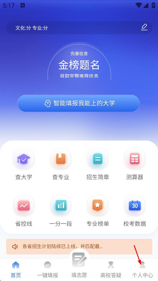 2、在首页,点击“个人中心”,进入艺考志愿填报登录页面。