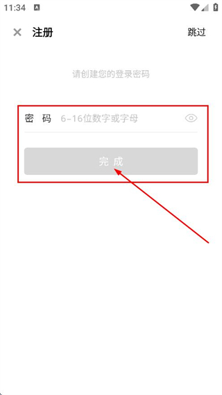 4、在设置密码界面,输入数字或字母的密码后点击完成,完成账号注册操作。