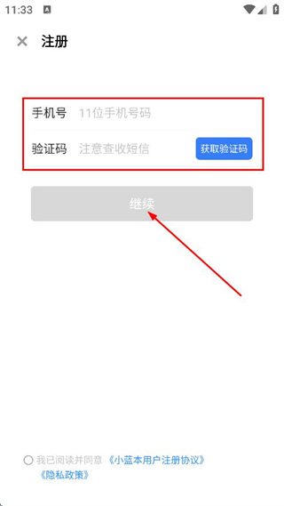 3、在注册界面,输入手机号,获取并输入验证码,点击继续。